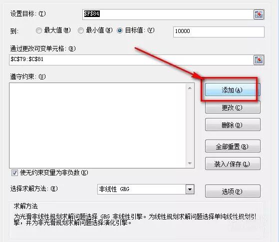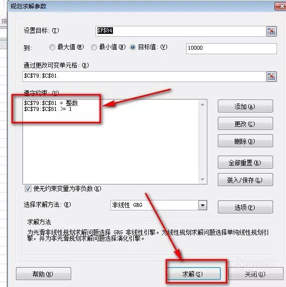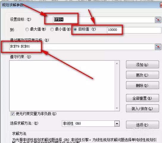 因为我要花10000块钱购买产品,这里就设置成10000。然后把可变单元格的区域设置好,这里我就选择“数量”区域。