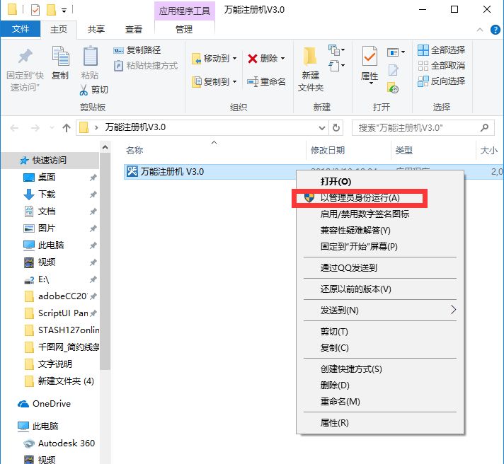 一、右键以管理员权限运行“万能注册机.V3.0”,软件使用前请关闭杀毒软件。