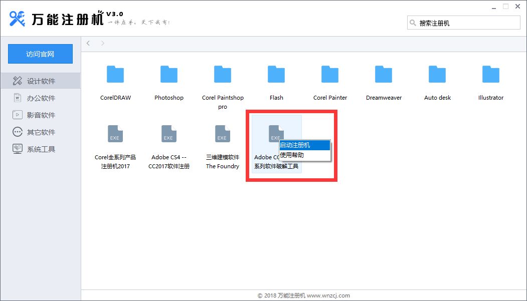 二、选择所需要的注册机,右键选择“启动注册机”以Adobe cc2018注册机为例。