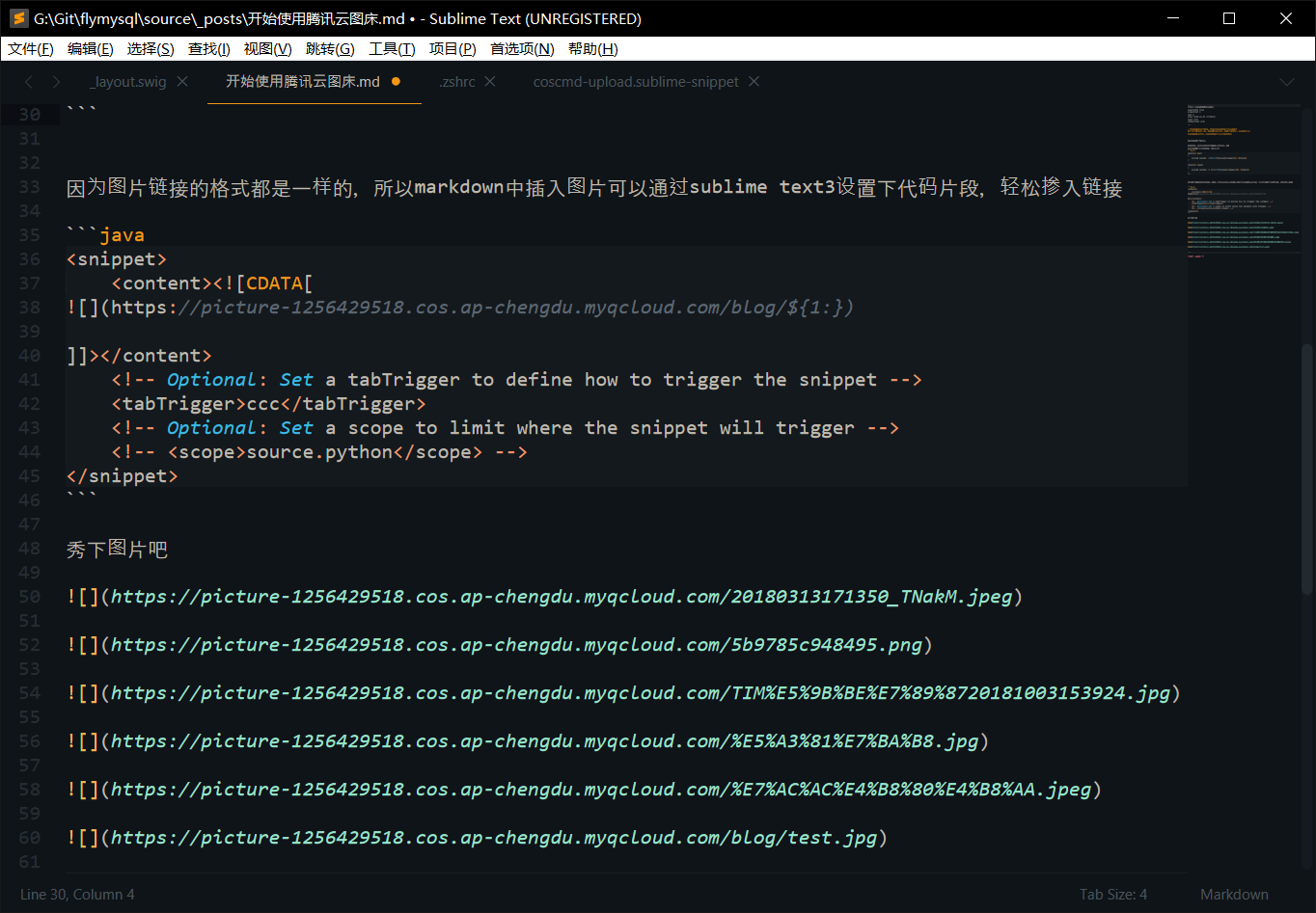 本人比较懒,懒得输入图片链接前面一长串,所以配置下sublime的代码片段,轻松插入